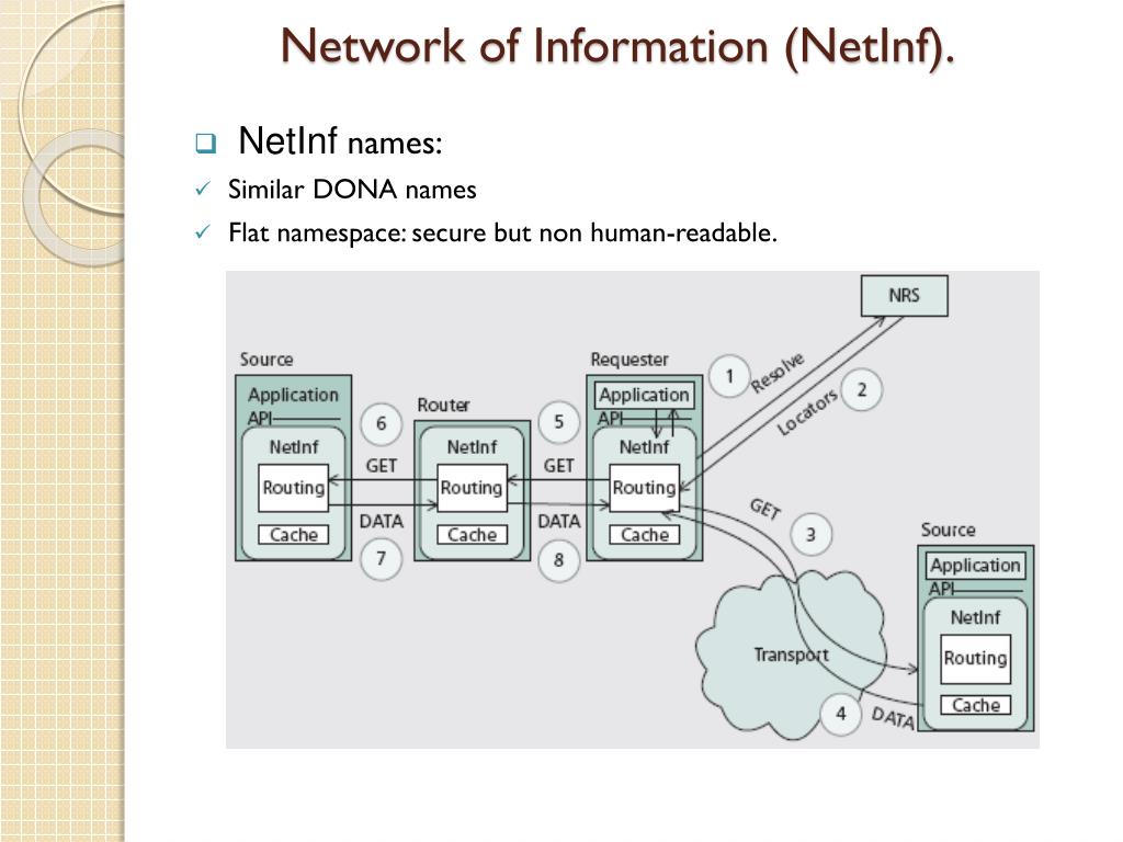 Network of Information (NetInf). • NetInf names: • Similar DONA names • Flat namespace: secure but non human-readable.
