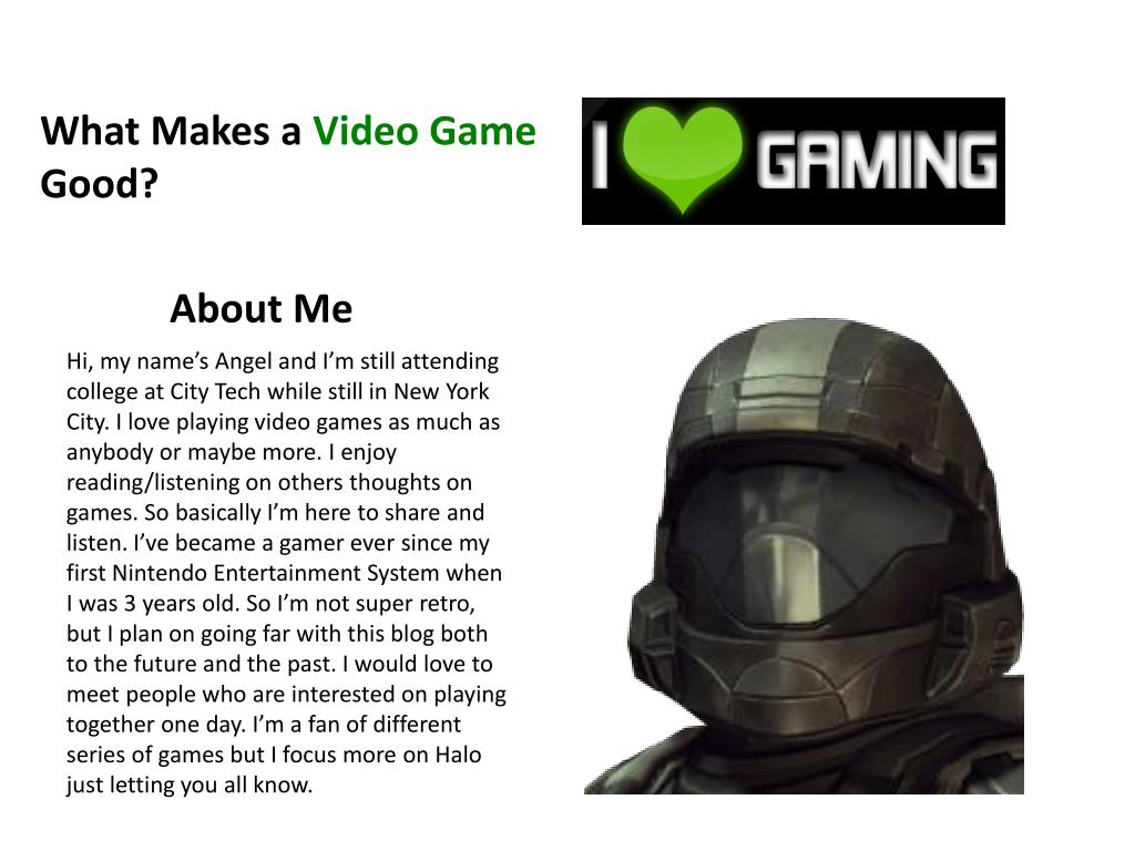 What Makes a Video Game Good? Mission Statement The mission of the blog “What Makes a Video Game Good?” will be to bring information to the people. I will share opinions from my self and others with people around the world about what makes a game good and explain those reasons. I will do research for more information and give citations. I will also put up videos for people who would like to get a better look. I will talk about history of games and gaming industries that are behind the development. I will make sure my audience is enjoying the page and will always give credits to where I found my information from normal blogs to the most famous websites.