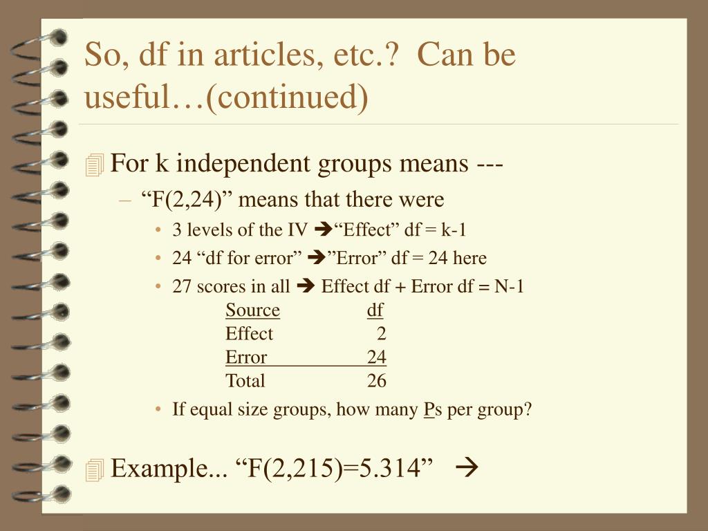 So, df in articles, etc.? Can be useful…(continued) • For k independent groups means --- • “F(2,24)” means that there were • 3 levels of the IV “Effect” df = k-1 • 24 “df for error” ”Error” df = 24 here • 27 scores in all Effect df + Error df = N-1 Sourcedf Effect 2 Error 24 Total 26 • If equal size groups, how many Ps per group? • Example... “F(2,215)=5.314”