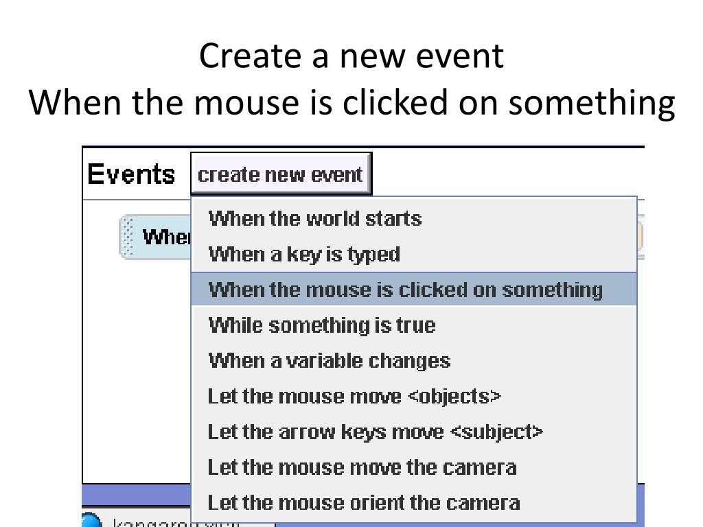 Here is the event.Now click “play” and click on different animals, but not the kangaroo… • The Kangaroo will go visit the animal you click on. • Click on another animal and it will go visit that animal.