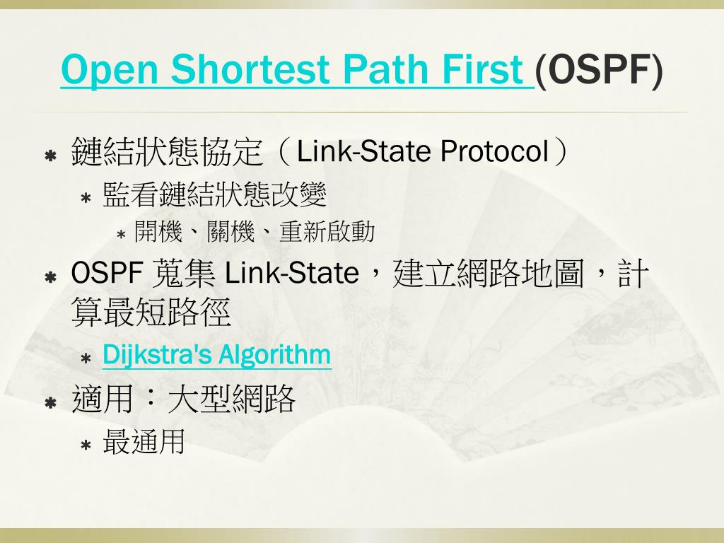 Open Shortest Path First (OSPF) • 鏈結狀態協定(Link-State Protocol) • 監看鏈結狀態改變 • 開機、關機、重新啟動 • OSPF 蒐集 Link-State,建立網路地圖,計算最短路徑 • Dijkstra'sAlgorithm • 適用:大型網路 • 最通用