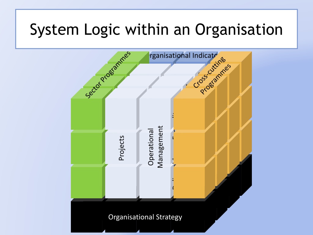 System Logic within an Organisation Organisational Indicators Cross-cutting Programmes Sector Programmes Location Funding Activity Expenditure Revenue Operational Management Projects Output Budget Deliverables Organisational Strategy