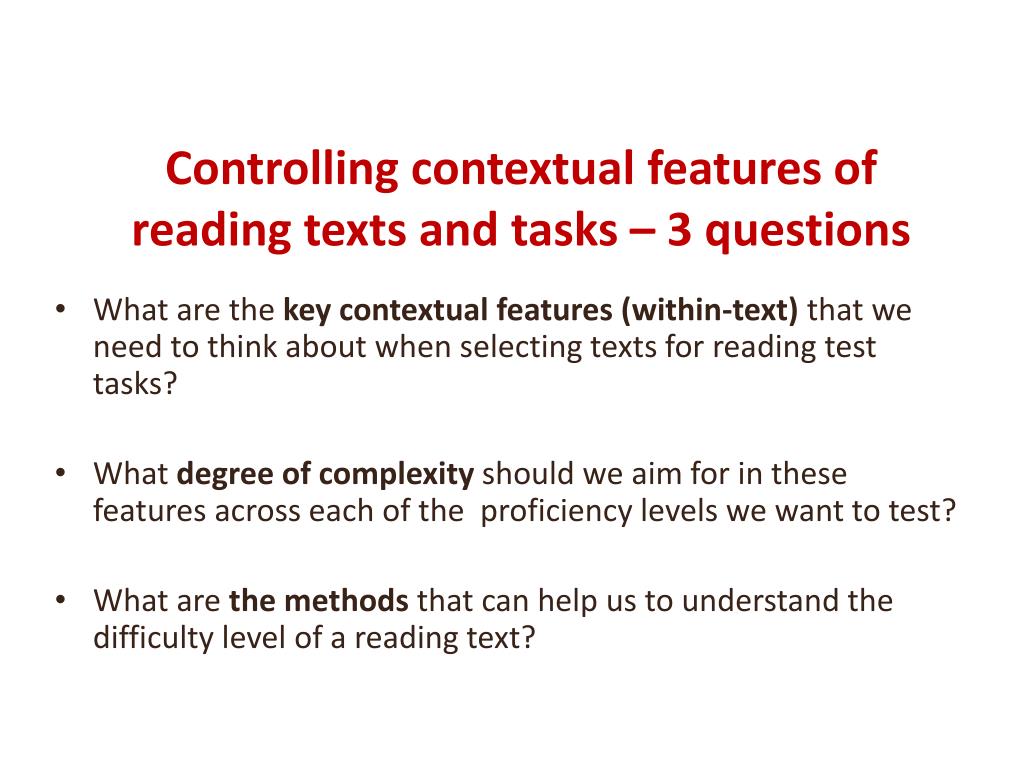 Controlling contextual features of reading texts and tasks – 3 questions What are the key contextual features (within-text) that we need to think about when selecting texts for reading test tasks? What degree of complexity should we aim for in these features across each of the proficiency levels we want to test? What are the methods that can help us to understand the difficulty level of a reading text?