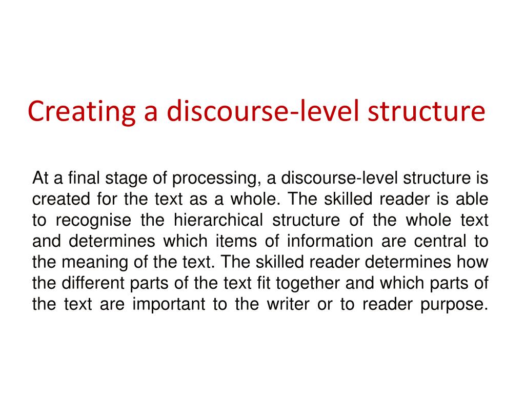Creating a discourse-level structure At a final stage of processing, a discourse-level structure is created for the text as a whole. The skilled reader is able to recognise the hierarchical structure of the whole text and determines which items of information are central to the meaning of the text. The skilled reader determines how the different parts of the text fit together and which parts of the text are important to the writer or to reader purpose.