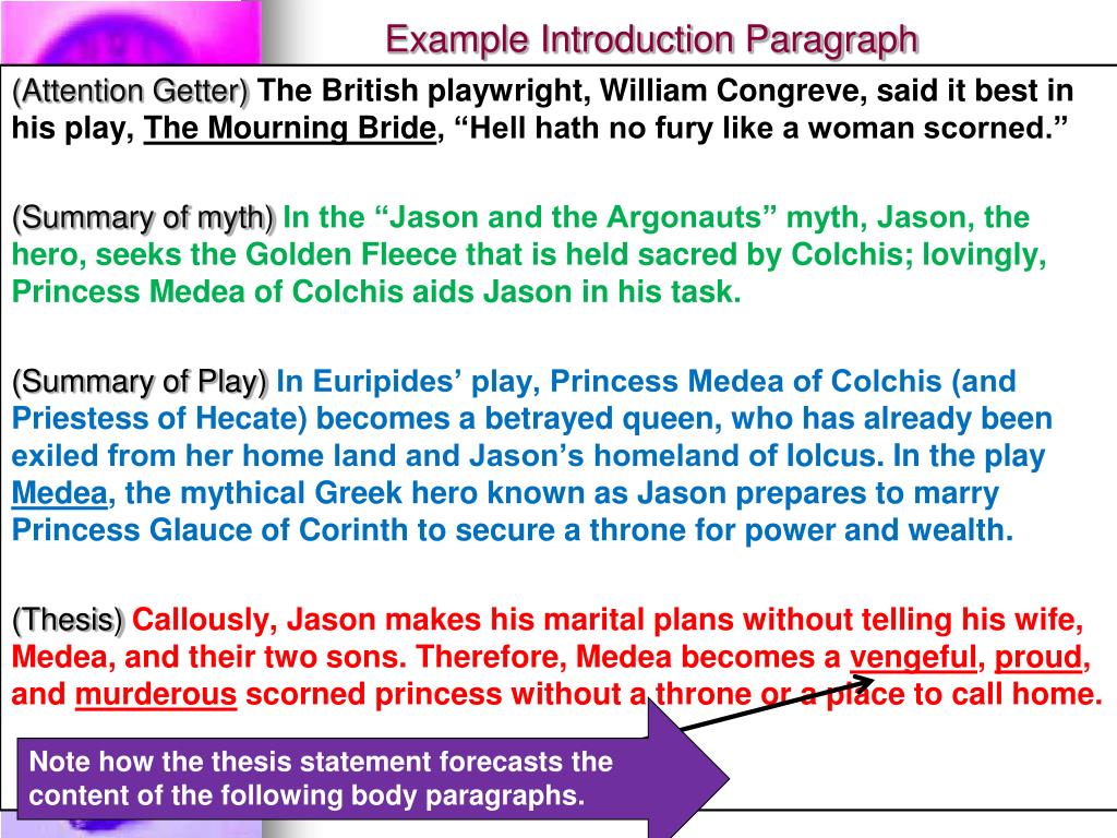 Example Introduction Paragraph (Attention Getter) The British playwright, William Congreve, said it best in his play, The Mourning Bride, “Hell hath no fury like a woman scorned.” (Summary of myth)In the “Jason and the Argonauts” myth, Jason, the hero, seeks the Golden Fleece that is held sacred by Colchis; lovingly, Princess Medea of Colchis aids Jason in his task. (Summary of Play)In Euripides’ play, Princess Medea of Colchis (and Priestess of Hecate) becomes a betrayed queen, who has already been exiled from her home land and Jason’s homeland of Iolcus. In the play Medea, the mythical Greek hero known as Jason prepares to marry Princess Glauce of Corinth to secure a throne for power and wealth. (Thesis) Callously, Jason makes his marital plans without telling his wife, Medea, and their two sons. Therefore, Medea becomes a vengeful, proud, and murderous scorned princess without a throne or a place to call home. Note how the thesis statement forecasts the content of the following body paragraphs.
