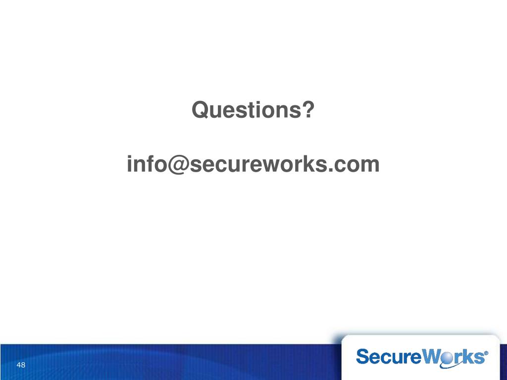 SecureWorks’ Counter Threat UnitSM (CTU) Facts • 30,000 malware specimens / day • Monitor ~20 Botnets • ~40 Vulnerabilities / business day • 1,000’s Security Events of interest / day • 10,000’s intelligence artifacts processed a day • 2,300 clients attacked / day • 1,500 attack types / day • ~3,000,000 IP addresses of attackers detected / year
