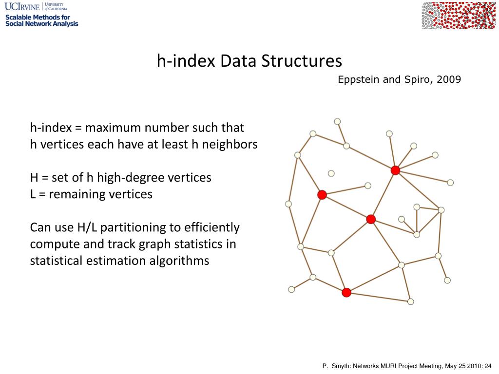 h-index Data Structures Eppstein and Spiro, 2009 h-index = maximum number such that h vertices each have at least h neighbors H = set of h high-degree vertices L = remaining vertices Can use H/L partitioning to efficiently compute and track graph statistics in statistical estimation algorithms