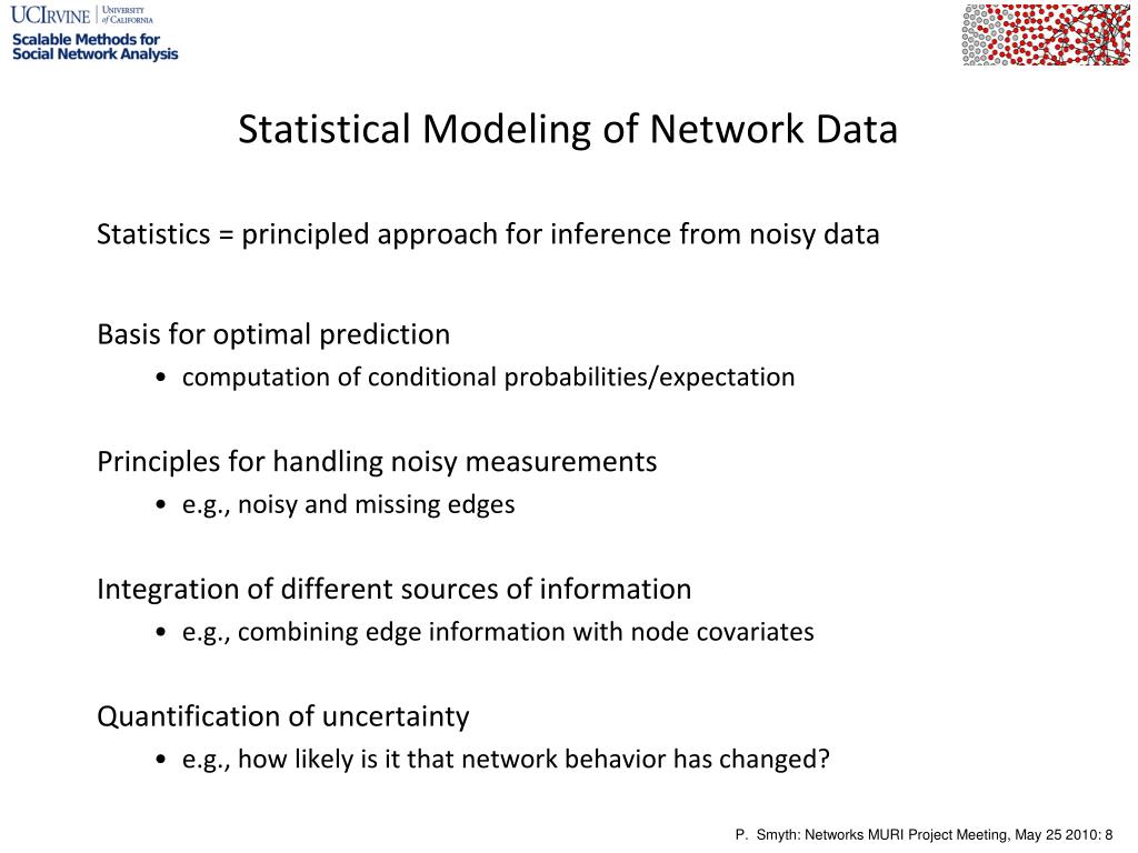Scalable Methods for the Analysis of Network-Based Data MURI Project: University of California, Irvine Project Meeting May 25 th 2010 Principal Investigator: Padhraic Smyth . Today’s Meeting. Goals Review our research progress Discussion, questions, interaction Feedback from visitors