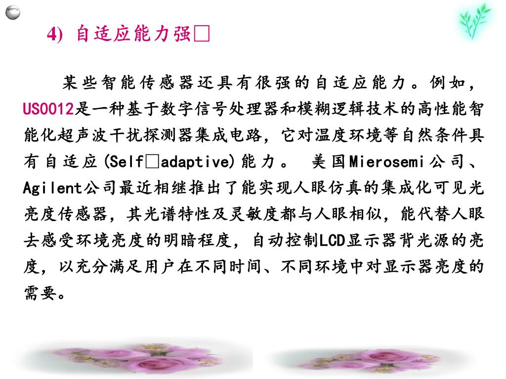 4) 自适应能力强 某些智能传感器还具有很强的自适应能力。例如, US0012是一种基于数字信号处理器和模糊逻辑技术的高性能智能化超声波干扰探测器集成电路,它对温度环境等自然条件具有自适应(Selfadaptive)能力。 美国Mierosemi公司、 Agilent公司最近相继推出了能实现人眼仿真的集成化可见光亮度传感器,其光谱特性及灵敏度都与人眼相似,能代替人眼去感受环境亮度的明暗程度,自动控制LCD显示器背光源的亮度,以充分满足用户在不同时间、不同环境中对显示器亮度的需要。