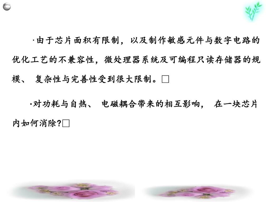 ·由于芯片面积有限制,以及制作敏感元件与数字电路的优化工艺的不兼容性,微处理器系统及可编程只读存储器的规模、 复杂性与完善性受到很大限制。 ·对功耗与自热、 电磁耦合带来的相互影响, 在一块芯片内如何消除?