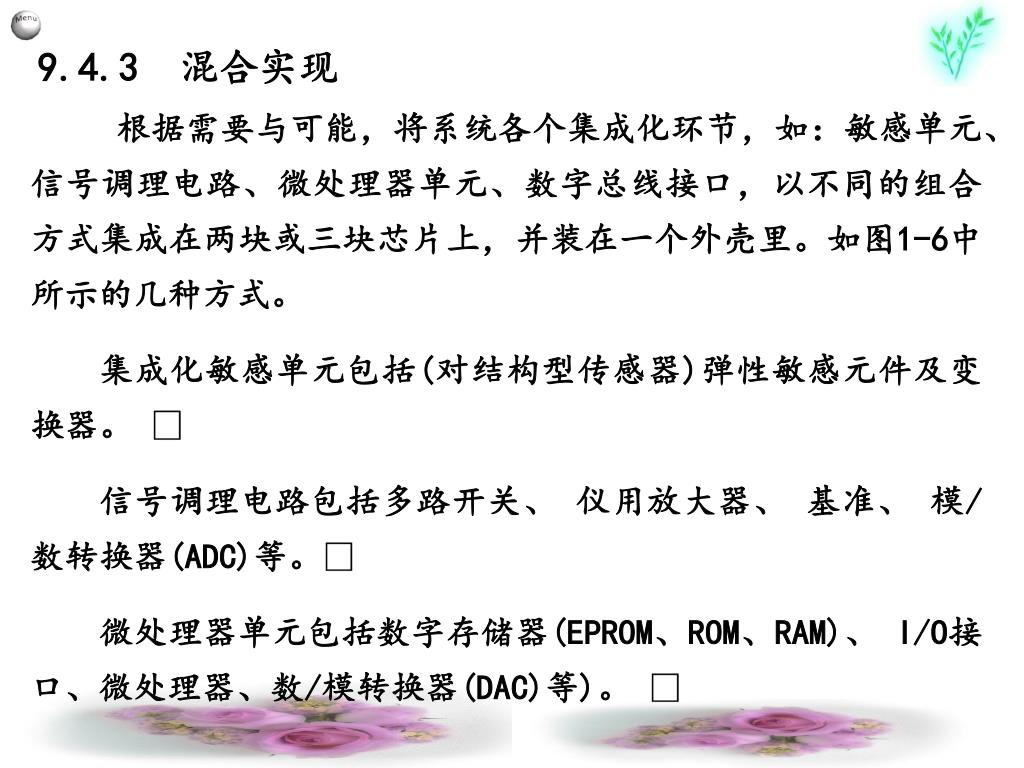 9.4.3 混合实现 根据需要与可能,将系统各个集成化环节,如:敏感单元、 信号调理电路、微处理器单元、数字总线接口,以不同的组合方式集成在两块或三块芯片上,并装在一个外壳里。如图1-6中所示的几种方式。 集成化敏感单元包括(对结构型传感器)弹性敏感元件及变换器。 信号调理电路包括多路开关、 仪用放大器、 基准、 模/数转换器(ADC)等。 微处理器单元包括数字存储器(EPROM、ROM、RAM)、 I/O接口、微处理器、数/模转换器(DAC)等)。