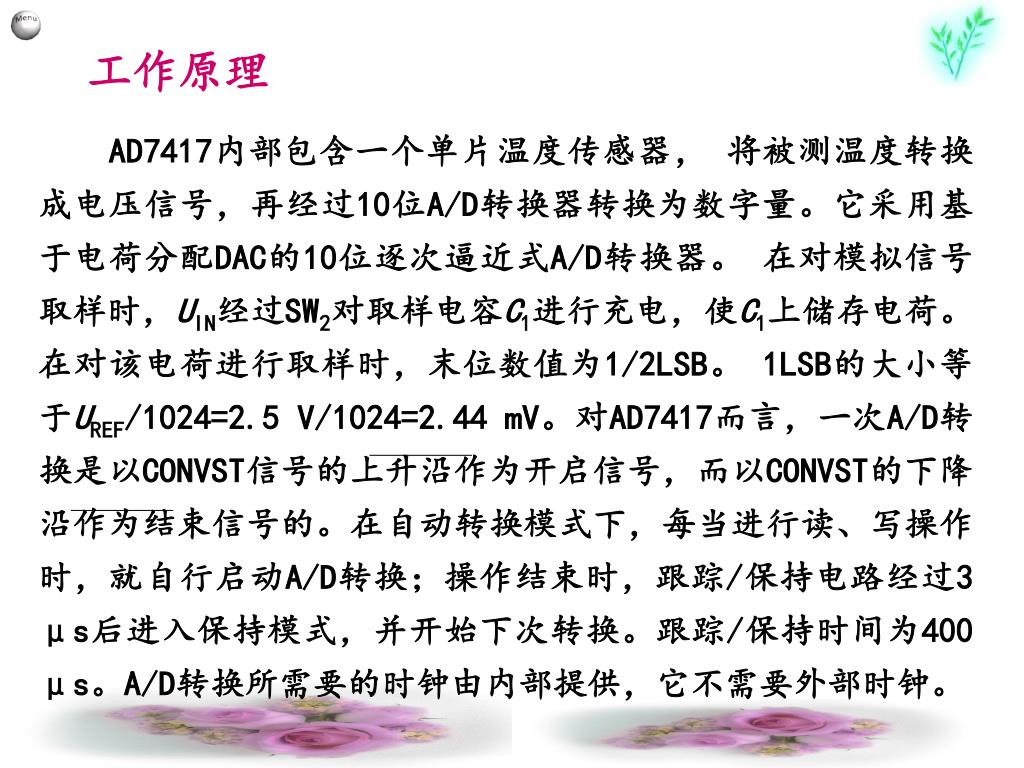 AD7417内部包含一个单片温度传感器, 将被测温度转换成电压信号,再经过10位A/D转换器转换为数字量。它采用基于电荷分配DAC的10位逐次逼近式A/D转换器。 在对模拟信号取样时,UIN经过SW2对取样电容C1进行充电,使C1上储存电荷。在对该电荷进行取样时,末位数值为1/2LSB。 1LSB的大小等于UREF/1024=2.5 V/1024=2.44 mV。对AD7417而言,一次A/D转换是以CONVST信号的上升沿作为开启信号,而以CONVST的下降沿作为结束信号的。在自动转换模式下,每当进行读、写操作时,就自行启动A/D转换;操作结束时,跟踪/保持电路经过3 μs后进入保持模式,并开始下次转换。跟踪/保持时间为400 μs。A/D转换所需要的时钟由内部提供,它不需要外部时钟。 工作原理