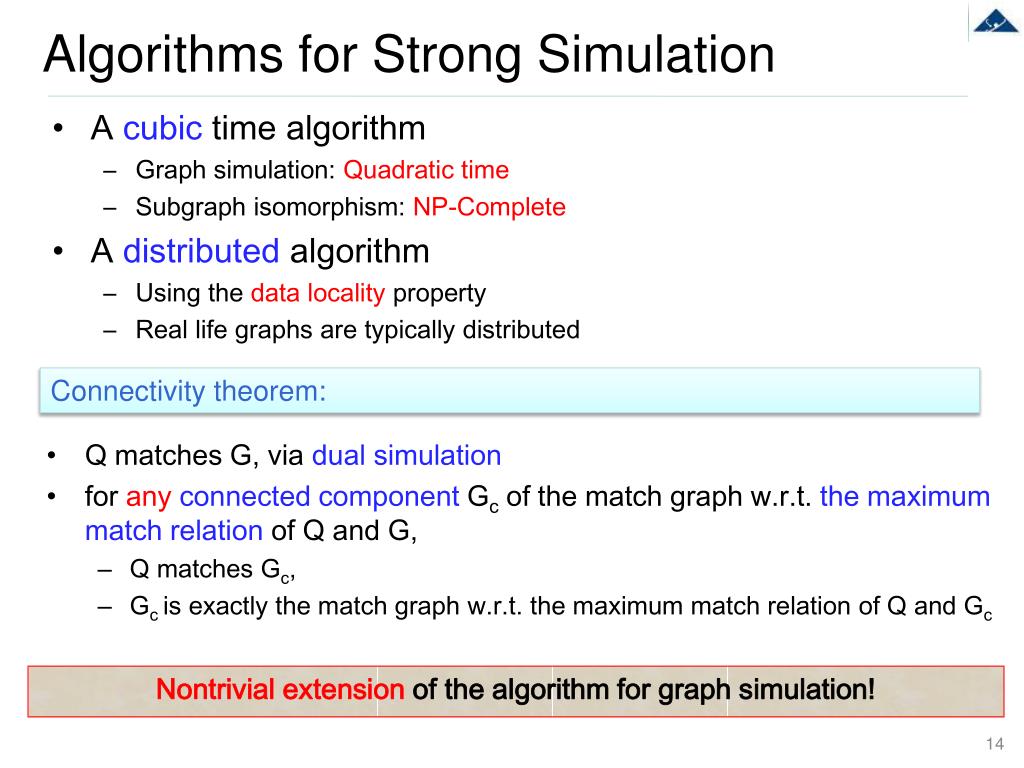 Algorithms for Strong Simulation • A cubic time algorithm • Graph simulation: Quadratic time • Subgraph isomorphism: NP-Complete • A distributed algorithm • Using the data locality property • Real life graphs are typically distributed Connectivity theorem: • Q matches G, via dual simulation • for anyconnected component Gc of the match graph w.r.t. the maximum match relation of Q and G, • Q matches Gc, • Gcis exactly the match graph w.r.t. the maximum match relation of Q and Gc Nontrivial extension of the algorithm for graph simulation!