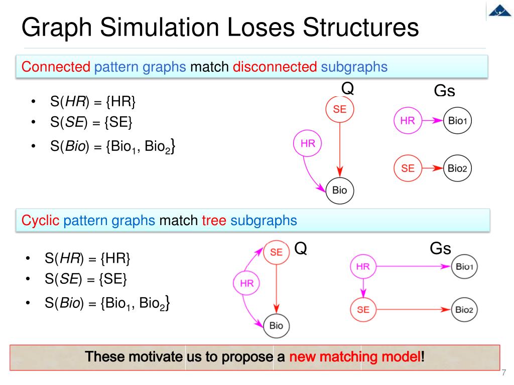 Graph Simulation Loses Structures Connected pattern graphs matchdisconnectedsubgraphs Q Gs • S(HR) = {HR} • S(SE) = {SE} • S(Bio) = {Bio1, Bio2} Cyclicpattern graphs match treesubgraphs Q Gs • S(HR) = {HR} • S(SE) = {SE} • S(Bio) = {Bio1, Bio2} These motivate us to propose a new matching model!