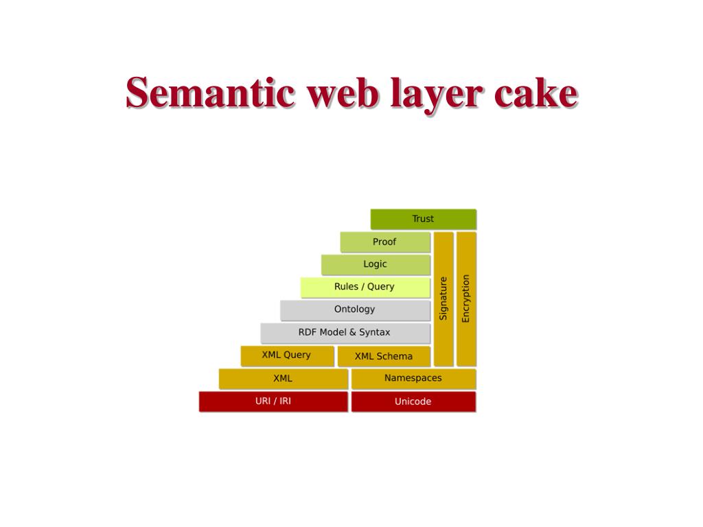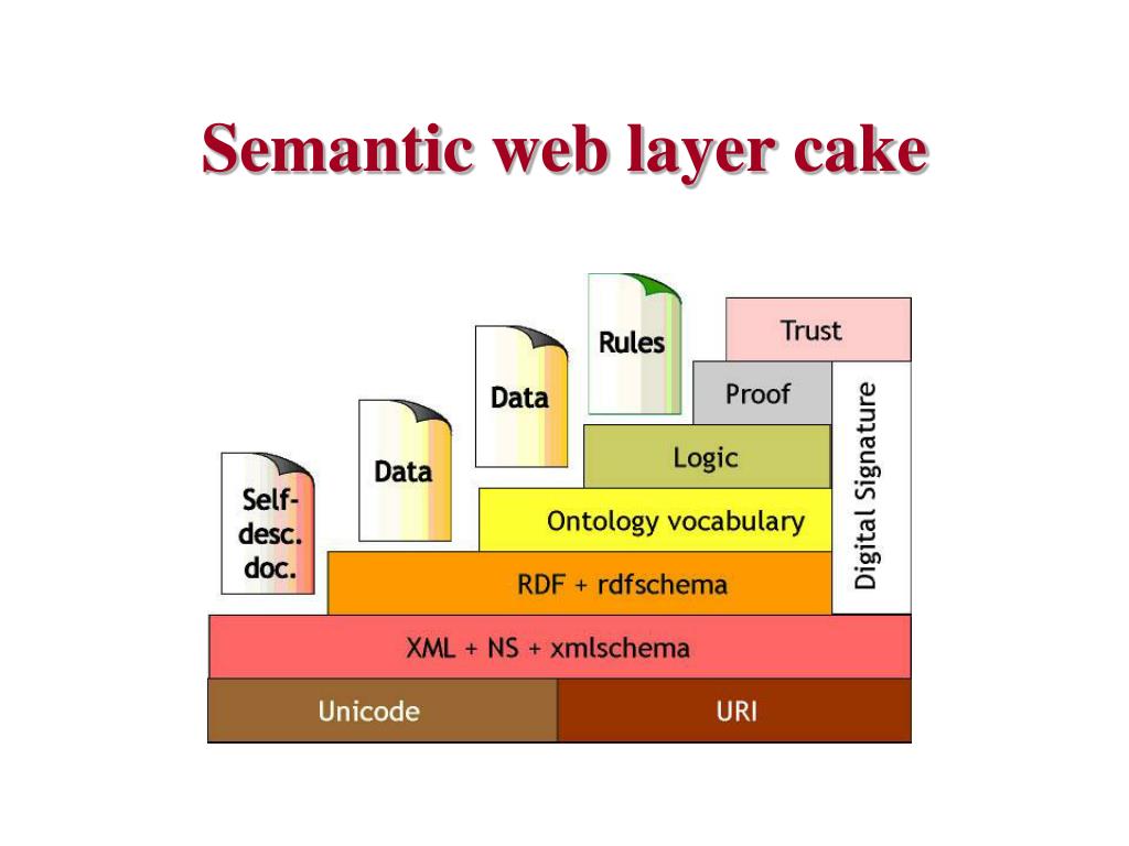 A szemantikus web szintjei • Az egyes szintek funkciói: • Az URI-k azonosítják a fogalmakat, amikről beszélünk (önleíró dokumentum); • Az XML biztosítja az egységes szintaxist; • Az RDF a szemantikai tartalmat hordozza; • Az ontológiák írják le a szabályokat, amelyek alapján következtetések vonhatók le; • Az ontológiák formális logikákon alapulnak • Az egyes szintek egymásra épülnek. • Minden szint eggyel komplexebb, mint az alatta elhelyezkedő. • Mégis az egyes szintek önállóan fejleszthetők.