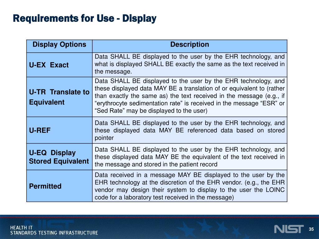 Assigning Incorporation Requirement – OBX.5 Store Action Options Available to IG Authors Impact on Implementers Data Element S-EX Store data exactly as received, no translation stored S-EX-TRStore data exactly as received; translation allowed, and if translated store translation S-TR Translate data received and store translation OR store data exactly as received OR both EHR must be designed to store only exact data received in the message EHR must be designed to store exact data received in the messages, and also may be designed to translate the data and store the translated version EHR may be designed to translate data received and store translated version OR may be designed to store exact data received OR may be designed to do both OBX.5 Observation Value For OBX.5 the Store requirement is specific to the data type IG Authors Choose Data Stored in EHR Data “10” must be stored, no translation may be stored S-EX Store data exactly as received, no translation stored 10 (If Data type is NM) OR X X “10” must be stored; may also be translated to “nn” and then translation also must be stored S-EX-TRStore data exactly as received; translation allowed, and if translated store translation OR X X “10” is translated to “nn” and translation must be stored S-TR Translate data received and store translation OR store data exactly as received OR both OR X “10” must be stored exactly as received OR X “10” is translated to “nn” and translation must be stored; and “10” also must be stored as exact data