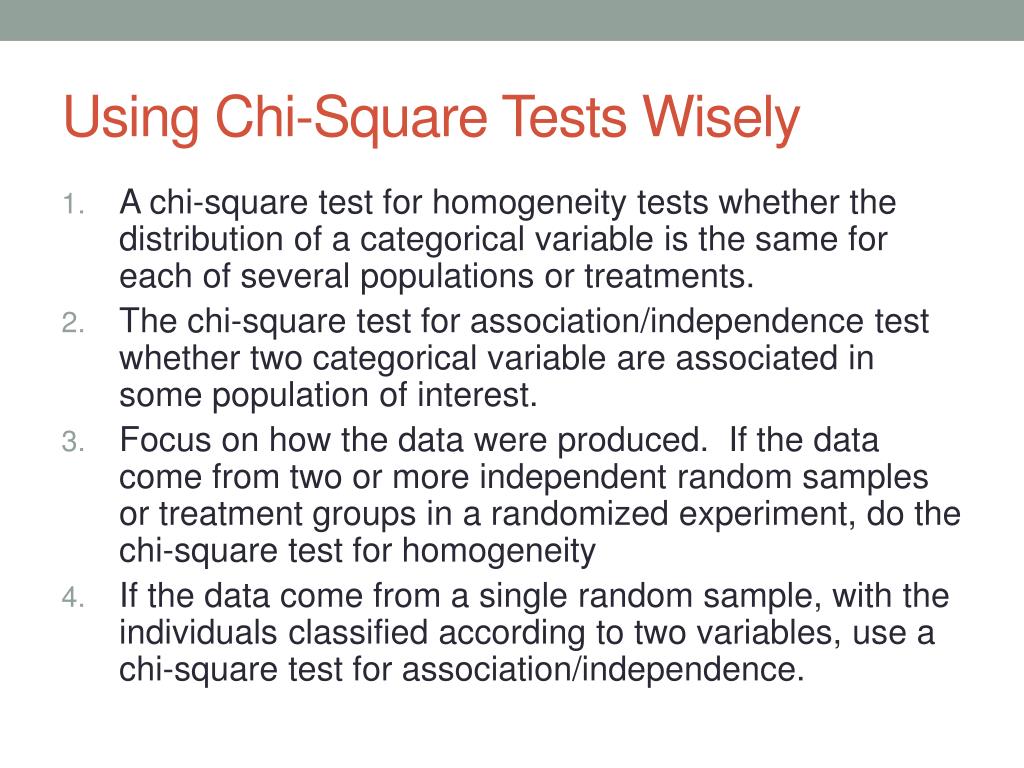 Using Chi-Square Tests Wisely • A chi-square test for homogeneity tests whether the distribution of a categorical variable is the same for each of several populations or treatments. • The chi-square test for association/independence test whether two categorical variable are associated in some population of interest. • Focus on how the data were produced. If the data come from two or more independent random samples or treatment groups in a randomized experiment, do the chi-square test for homogeneity • If the data come from a single random sample, with the individuals classified according to two variables, use a chi-square test for association/independence.