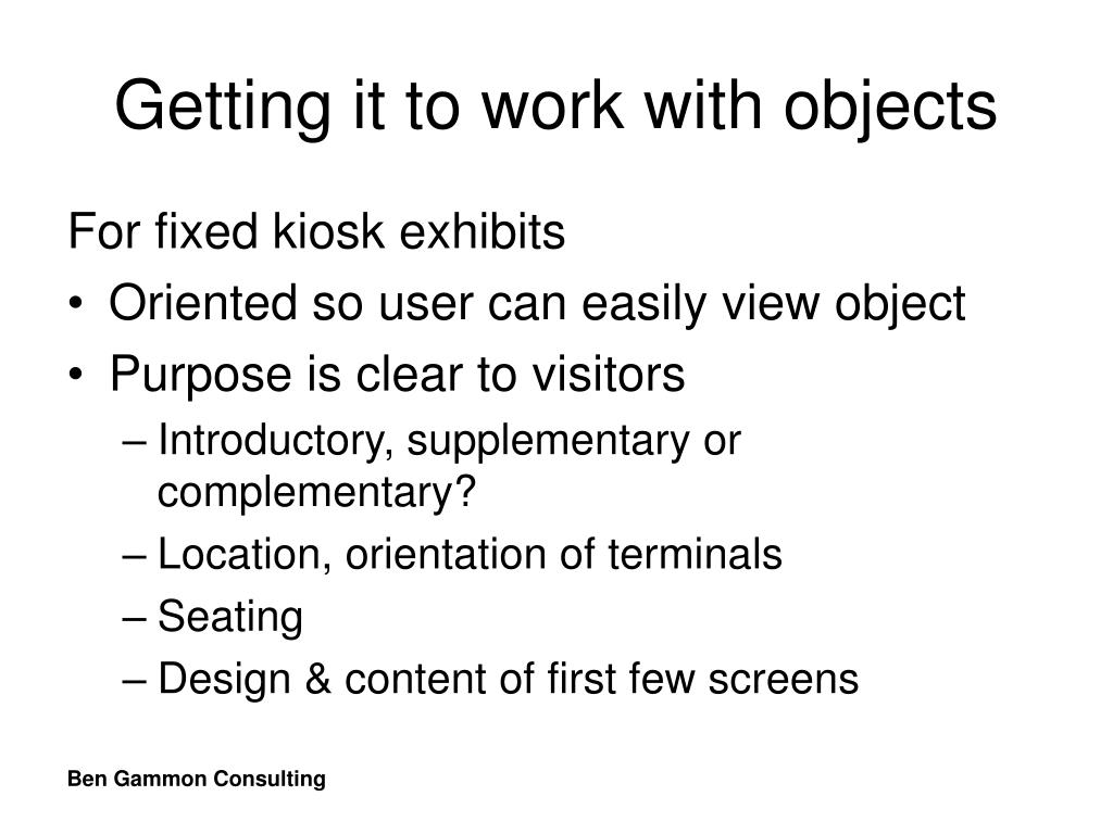 Getting it to work with objects For fixed kiosk exhibits • Oriented so user can easily view object • Purpose is clear to visitors • Introductory, supplementary or complementary? • Location, orientation of terminals • Seating • Design & content of first few screens