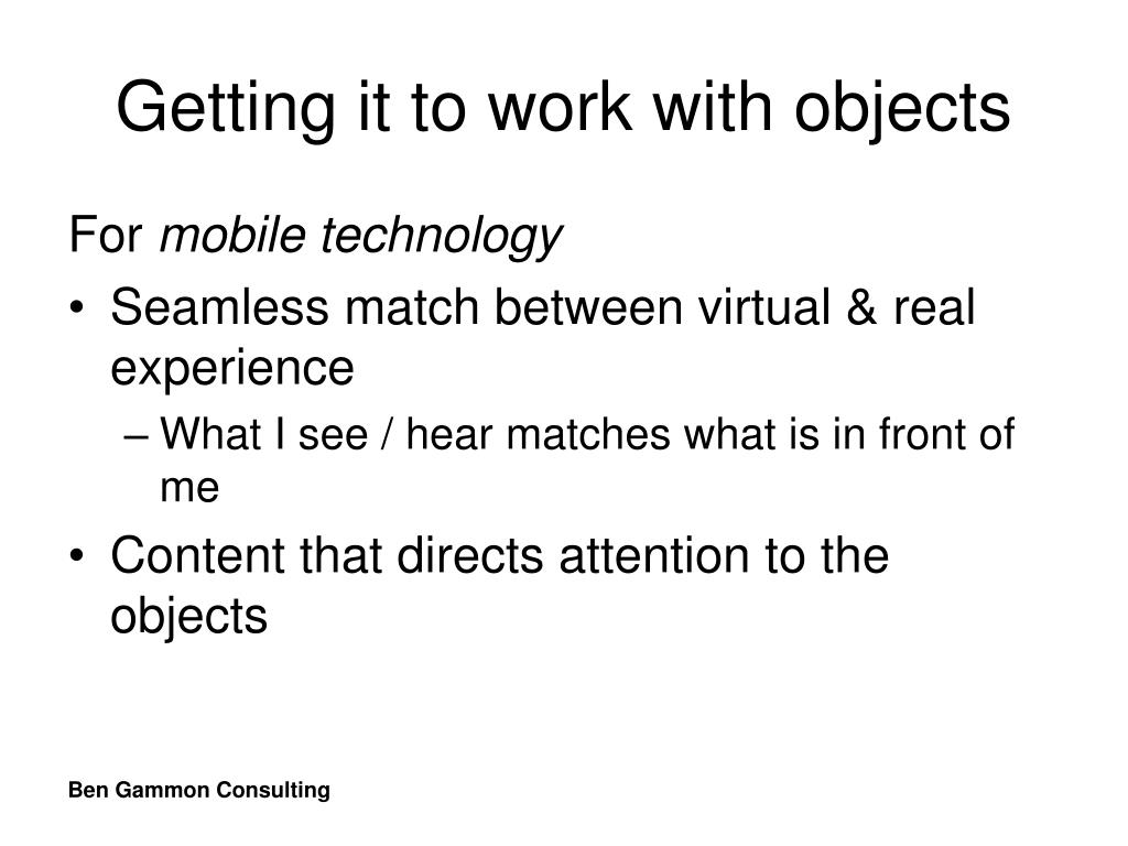 Getting it to work with objects For mobile technology • Seamless match between virtual & real experience • What I see / hear matches what is in front of me • Content that directs attention to the objects