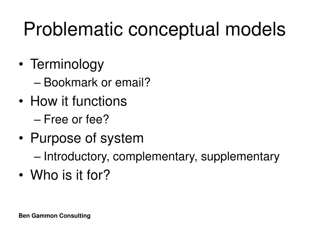 Problematic conceptual models • Terminology • Bookmark or email? • How it functions • Free or fee? • Purpose of system • Introductory, complementary, supplementary • Who is it for?
