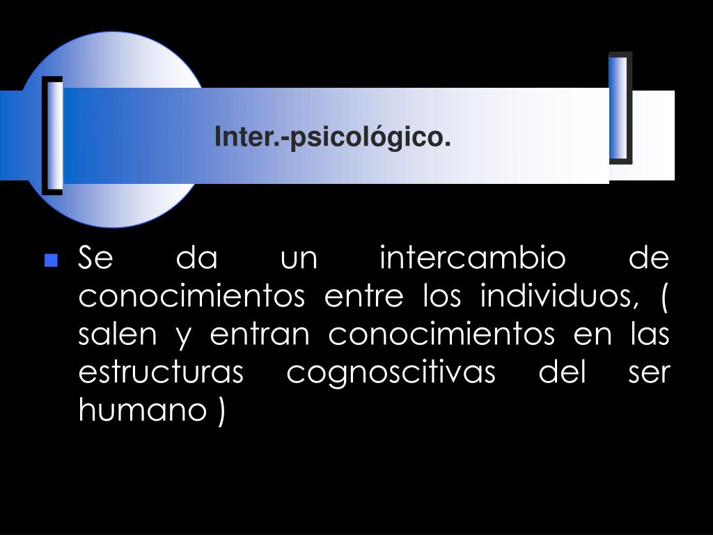 Se da un intercambio de conocimientos entre los individuos, ( salen y entran conocimientos en las estructuras cognoscitivas del ser humano ) Inter.-psicológico.