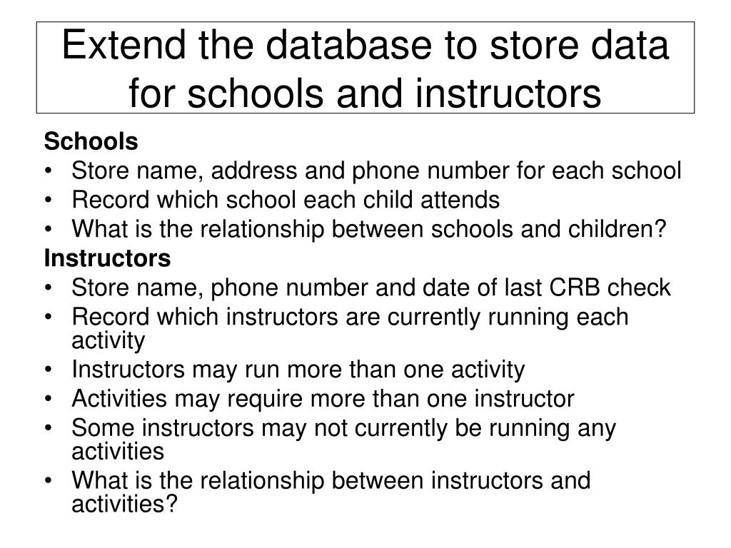 Extend the database to store data for schools and instructors Schools • Store name, address and phone number for each school • Record which school each child attends • What is the relationship between schools and children? Instructors • Store name, phone number and date of last CRB check • Record which instructors are currently running each activity • Instructors may run more than one activity • Activities may require more than one instructor • Some instructors may not currently be running any activities • What is the relationship between instructors and activities?