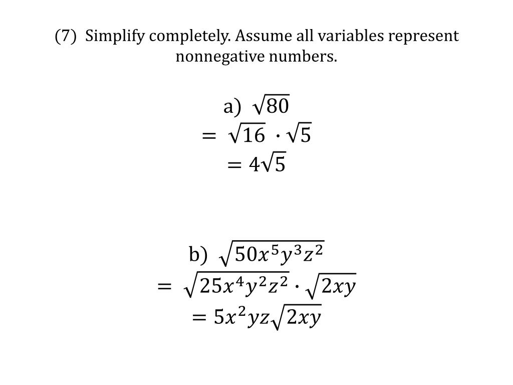 (7) Simplify completely. Assume all variables represent nonnegative numbers. a) b)