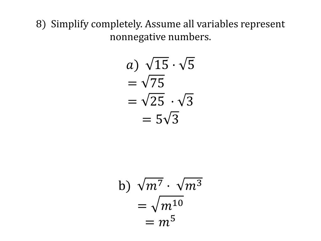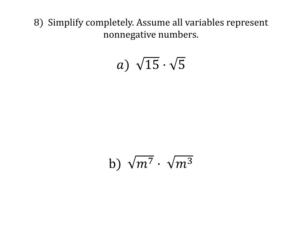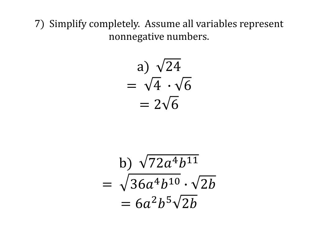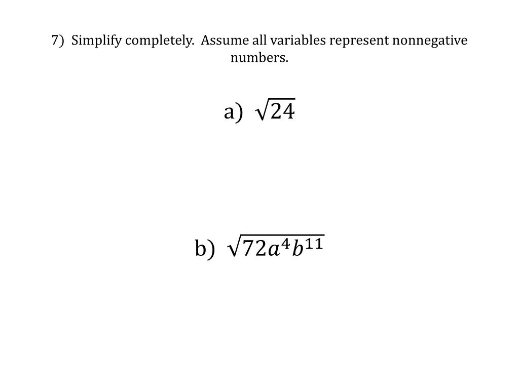 7) Simplify completely. Assume all variables represent nonnegative numbers. a) b)