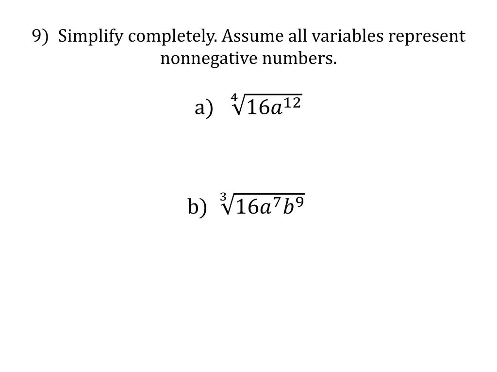 9) Simplify completely. Assume all variables represent nonnegative numbers. a) b)
