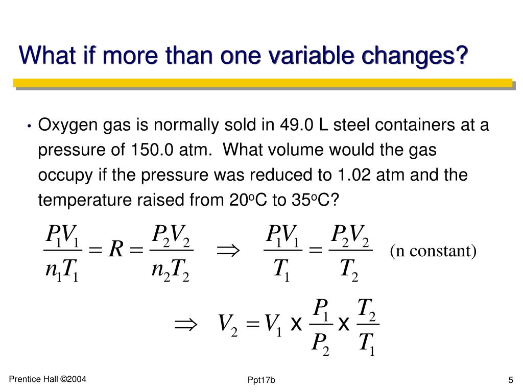 What if more than one variable changes? • Oxygen gas is normally sold in 49.0 L steel containers at a pressure of 150.0 atm. What volume would the gas occupy if the pressure was reduced to 1.02 atm and the temperature raised from 20oC to 35oC? Ppt17b