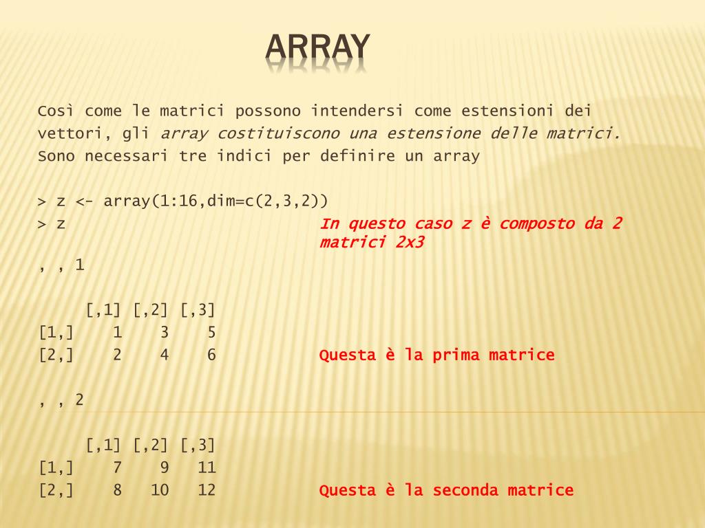 ARRAY Così come le matrici possono intendersi come estensioni dei vettori, gli array costituiscono una estensione delle matrici. Sono necessari tre indici per definire un array > z <- array(1:16,dim=c(2,3,2)) > z In questo caso z è composto da 2 matrici 2x3 , , 1 [,1] [,2] [,3] [1,] 1 3 5 [2,] 2 4 6Questa è la prima matrice , , 2 [,1] [,2] [,3] [1,] 7 9 11 [2,] 8 10 12Questa è la seconda matrice