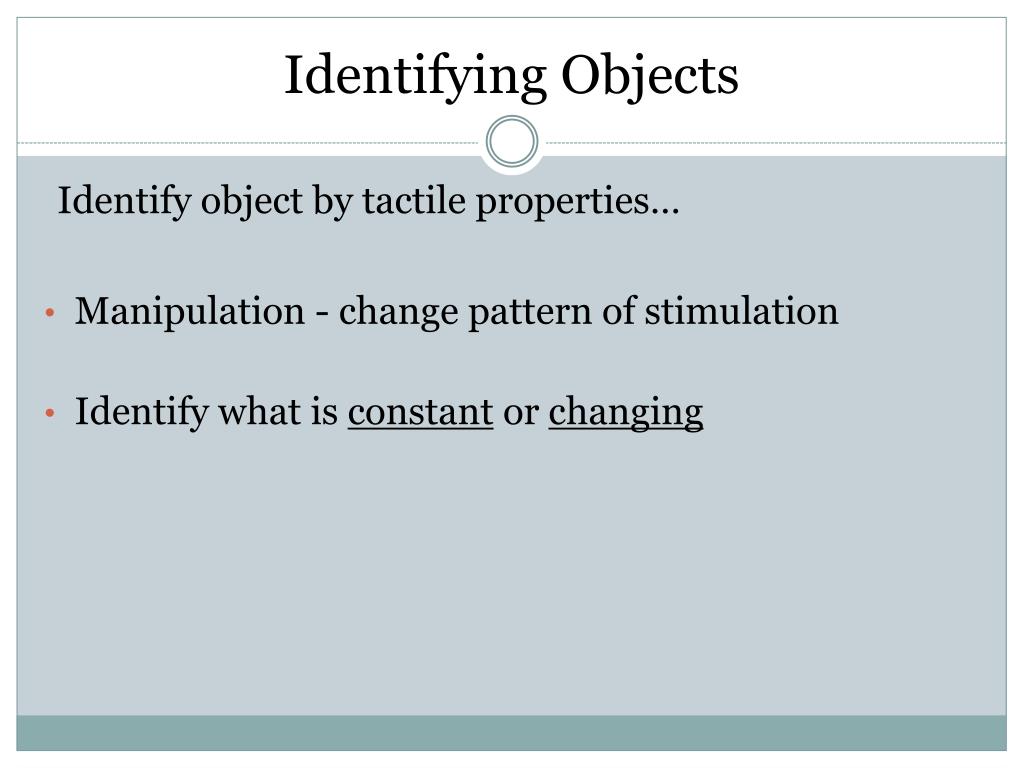 Identifying Objects Identify object by tactile properties… • Manipulation - change pattern of stimulation • Identify what is constant or changing