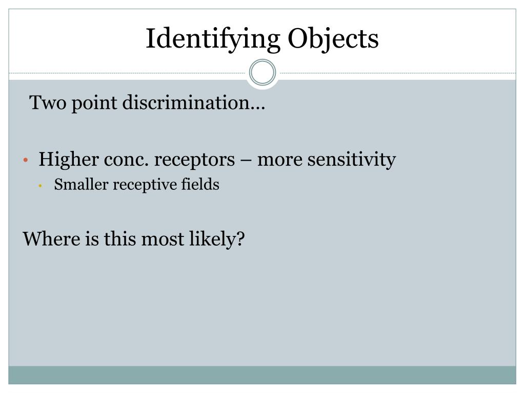 Identifying Objects Two point discrimination… • Higher conc. receptors – more sensitivity • Smaller receptive fields Where is this most likely?