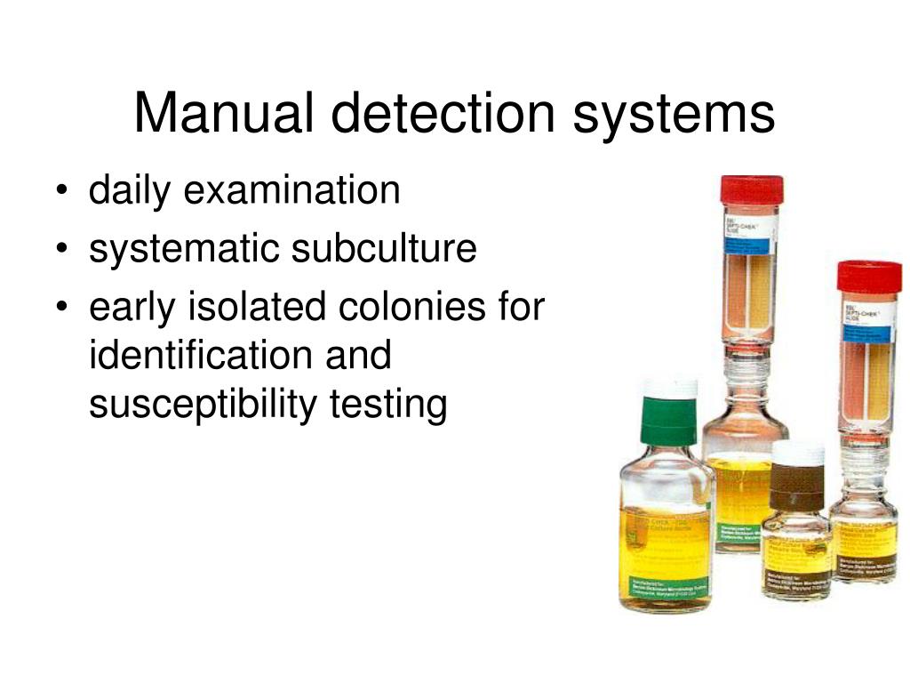 Manual detection systems • daily examination • systematic subculture • early isolated colonies for identification and susceptibility testing