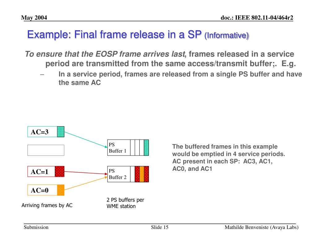 AC=3 PS Buffer 1 PS Buffer 2 AC=1 AC=0 2 PS buffers per WME station Arriving frames by AC Example: Final frame release in a SP (Informative) To ensure that the EOSP frame arrives last, frames released in a service period are transmitted from the same access/transmit buffer;. E.g. • In a service period, frames are released from a single PS buffer and have the same AC The buffered frames in this example would be emptied in 4 service periods. AC present in each SP: AC3, AC1, AC0, and AC1 Mathilde Benveniste (Avaya Labs)