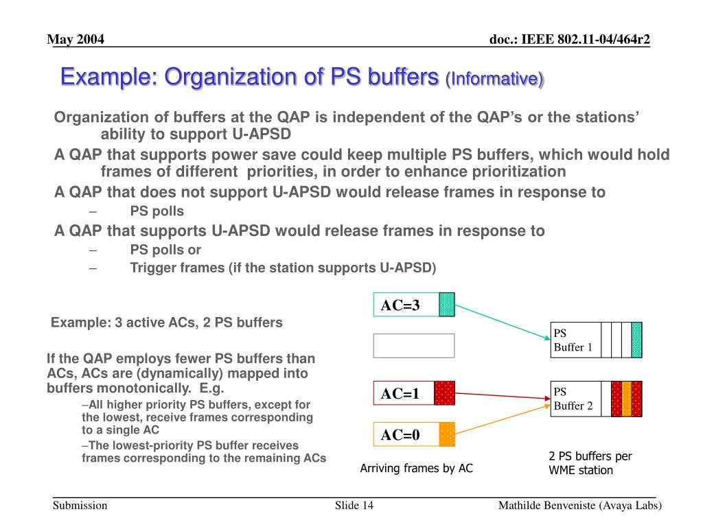 AC=3 PS Buffer 1 PS Buffer 2 AC=1 AC=0 2 PS buffers per WME station Arriving frames by AC Example: Organization of PS buffers (Informative) Organization of buffers at the QAP is independent of the QAP’s or the stations’ ability to support U-APSD A QAP that supports power save could keep multiple PS buffers, which would hold frames of different priorities, in order to enhance prioritization A QAP that does not support U-APSD would release frames in response to • PS polls A QAP that supports U-APSD would release frames in response to • PS polls or • Trigger frames (if the station supports U-APSD) • Example: 3 active ACs, 2 PS buffers • If the QAP employs fewer PS buffers than ACs, ACs are (dynamically) mapped into buffers monotonically. E.g. • All higher priority PS buffers, except for the lowest, receive frames corresponding to a single AC • The lowest-priority PS buffer receives frames corresponding to the remaining ACs Mathilde Benveniste (Avaya Labs)