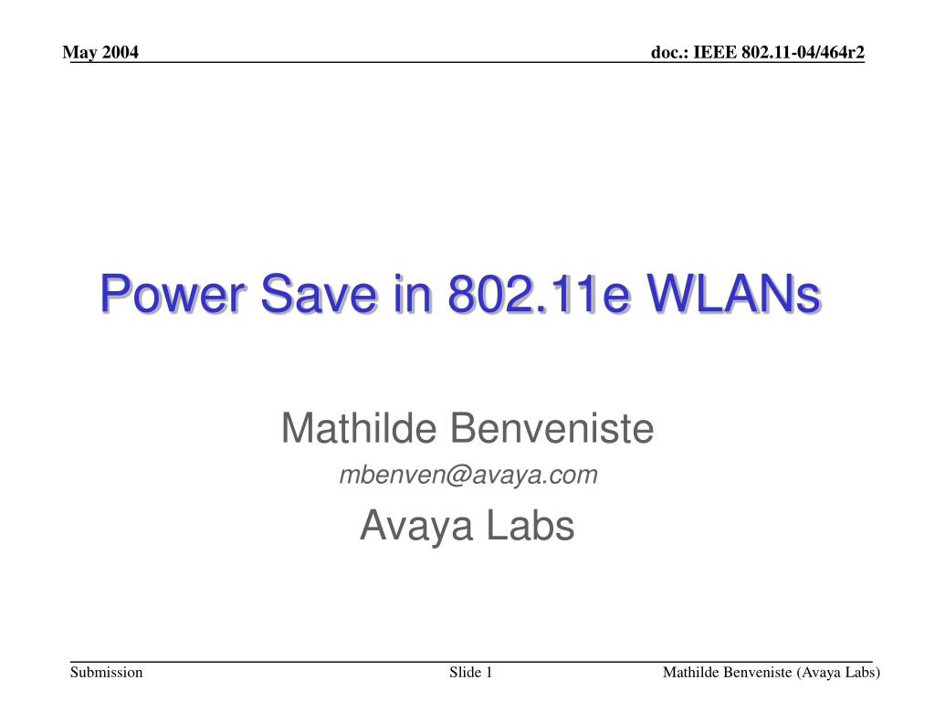 Power Save in 802.11e WLANs Mathilde Benveniste mbenven@avaya.com Avaya Labs Mathilde Benveniste (Avaya Labs)