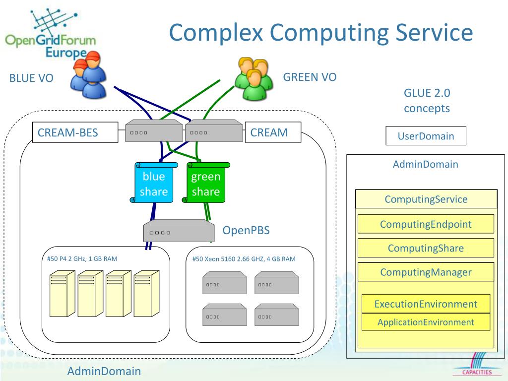 #50 P4 2 GHz, 1 GB RAM #50 Xeon 5160 2.66 GHZ, 4 GB RAM Complex Computing Service GREEN VO BLUE VO GLUE 2.0 concepts CREAM CREAM-BES UserDomain AdminDomain blue share green share ComputingService ComputingEndpoint OpenPBS ComputingShare ComputingManager ExecutionEnvironment ApplicationEnvironment AdminDomain