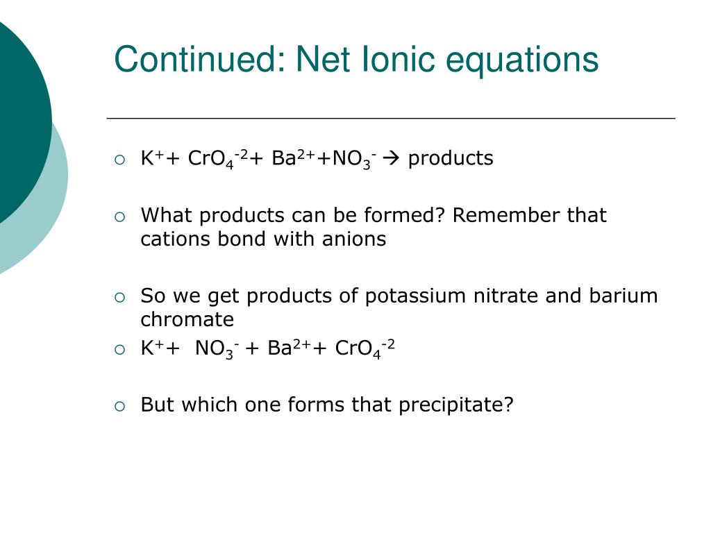 Continued: Net Ionic equations • K++ CrO4-2+ Ba2++NO3- products • What products can be formed? Remember that cations bond with anions • So we get products of potassium nitrate and barium chromate • K++ NO3- + Ba2++ CrO4-2 • But which one forms that precipitate?