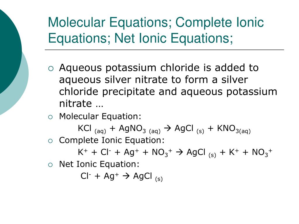 Molecular Equations; Complete Ionic Equations; Net Ionic Equations; • Aqueous potassium chloride is added to aqueous silver nitrate to form a silver chloride precipitate and aqueous potassium nitrate … • Molecular Equation: KCl (aq) + AgNO3(aq) AgCl (s) + KNO3(aq) • Complete Ionic Equation: K+ + Cl- + Ag+ + NO3+ AgCl (s) + K+ + NO3+ • Net Ionic Equation: Cl- + Ag+ AgCl (s)