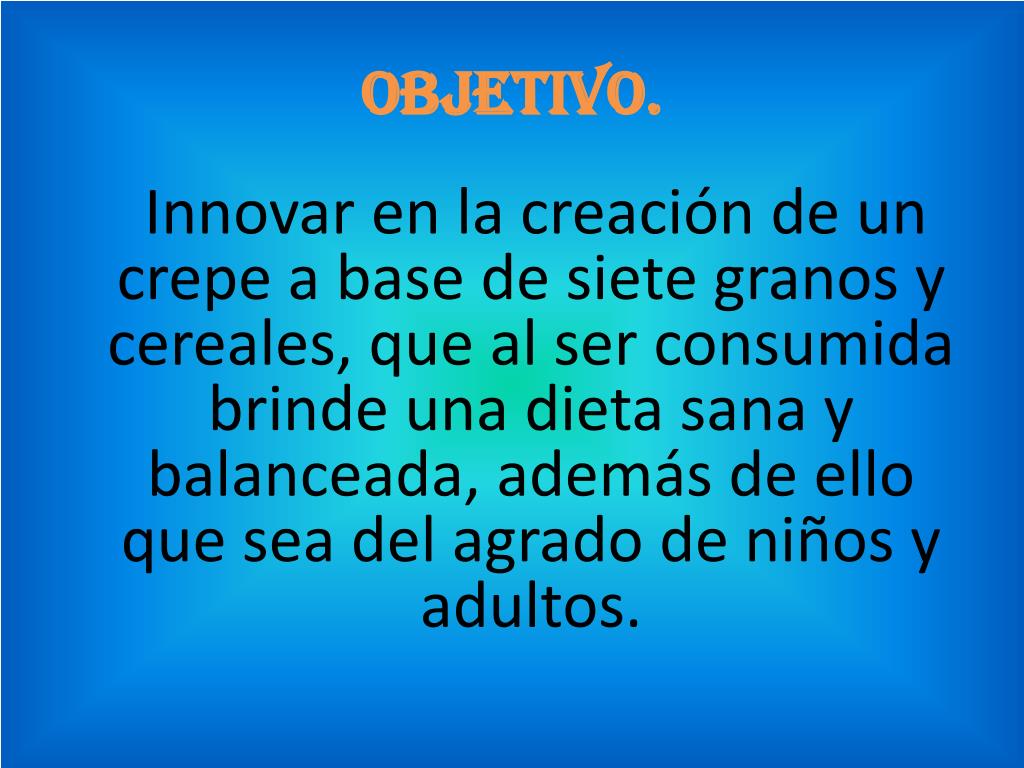 OBJETIVO. Innovar en la creación de un crepe a base de siete granos y cereales, que al ser consumida brinde una dieta sana y balanceada, además de ello que sea del agrado de niños y adultos.