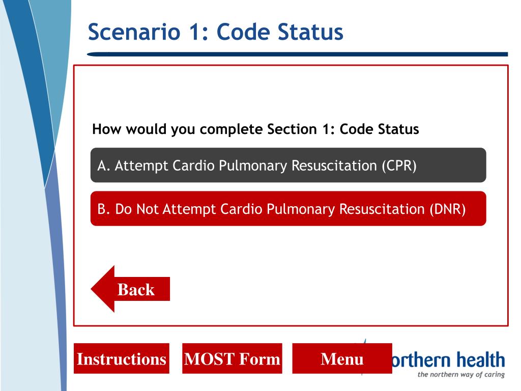 Scenario 1: Code Status How would you complete Section 1: Code Status A. Attempt Cardio Pulmonary Resuscitation (CPR) B. Do Not Attempt Cardio Pulmonary Resuscitation (DNR) Back Instructions MOST Form Menu