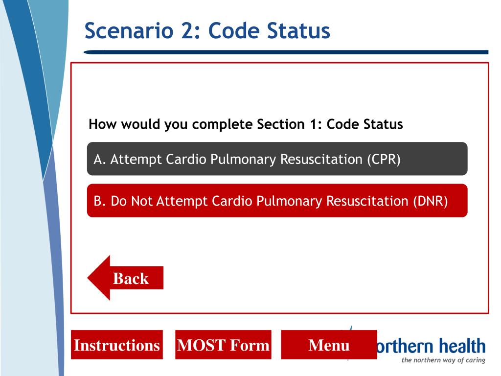 Scenario 2: Code Status How would you complete Section 1: Code Status A. Attempt Cardio Pulmonary Resuscitation (CPR) B. Do Not Attempt Cardio Pulmonary Resuscitation (DNR) Back Instructions MOST Form Menu