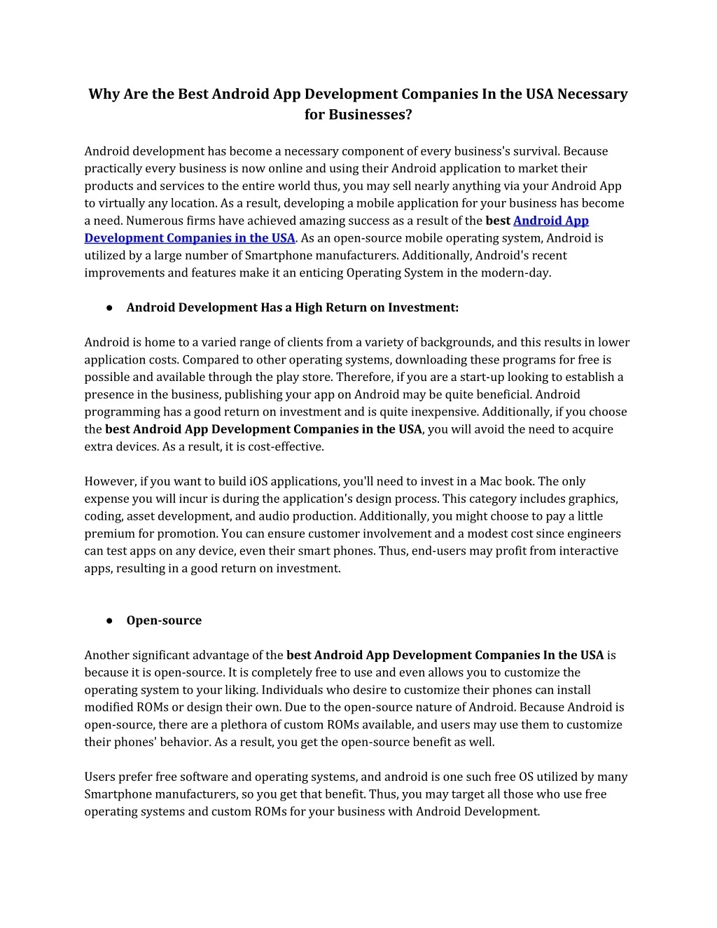 Why Are the Best Android App Development Companies In the USA Necessary for Businesses? Android development has become a necessary component of every business's survival. Because practically every business is now online and using their Android application to market their products and services to the entire world thus, you may sell nearly anything via your Android App to virtually any location. As a result, developing a mobile application for your business has become a need. Numerous firms have achieved amazing success as a result of the best Android App Development Companies in the USA. As an open-source mobile operating system, Android is utilized by a large number of Smartphone manufacturers. Additionally, Android's recent improvements and features make it an enticing Operating System in the modern-day. ●Android Development Has a High Return on Investment: Android is home to a varied range of clients from a variety of backgrounds, and this results in lower application costs. Compared to other operating systems, downloading these programs for free is possible and available through the play store. Therefore, if you are a start-up looking to establish a presence in the business, publishing your app on Android may be quite beneficial. Android programming has a good return on investment and is quite inexpensive. Additionally, if you choose the best Android App Development Companies in the USA, you will avoid the need to acquire extra devices. As a result, it is cost-effective. However, if you want to build iOS applications, you'll need to invest in a Mac book. The only expense you will incur is during the application's design process. This category includes graphics, coding, asset development, and audio production. Additionally, you might choose to pay a little premium for promotion. You can ensure customer involvement and a modest cost since engineers can test apps on any device, even their smart phones. Thus, end-users may profit from interactive apps, resulting in a good return on investment. ●Open-source Another significant advantage of the best Android App Development Companies In the USA is because it is open-source. It is completely free to use and even allows you to customize the operating system to your liking. Individuals who desire to customize their phones can install modified ROMs or design their own. Due to the open-source nature of Android. Because Android is open-source, there are a plethora of custom ROMs available, and users may use them to customize their phones' behavior. As a result, you get the open-source benefit as well. Users prefer free software and operating systems, and android is one such free OS utilized by many Smartphone manufacturers, so you get that benefit. Thus, you may target all those who use free operating systems and custom ROMs for your business with Android Development.