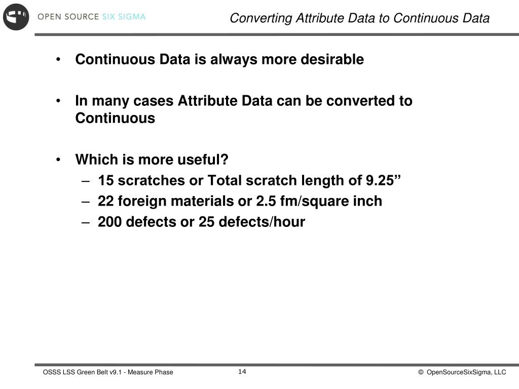 Continuous Data is always more desirable In many cases Attribute Data can be converted to Continuous Which is more useful? 15 scratches or Total scratch length of 9.25” 22 foreign materials or 2.5 fm/square inch 200 defects or 25 defects/hour Converting Attribute Data to Continuous Data