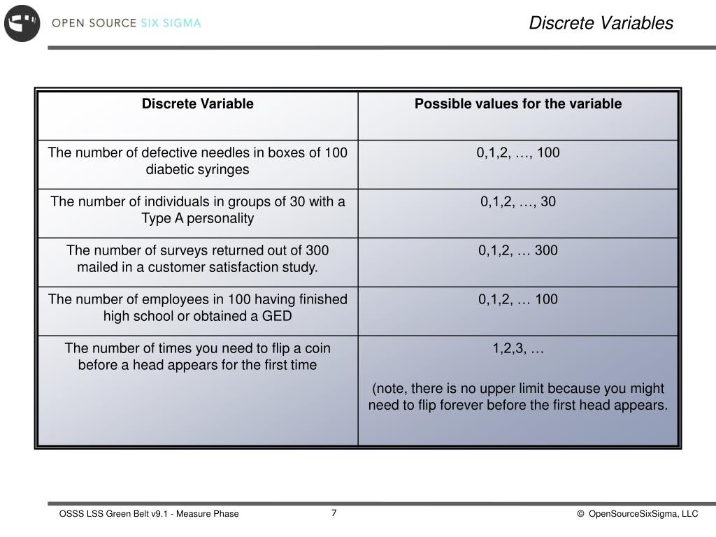 Attribute Data (Qualitative) Is always binary, there are only two possible values (0, 1) Yes, No Go, No go Pass/Fail Variable Data (Quantitative) Discrete (Count) Data Can be categorized in a classification and is based on counts. Number of defects Number of defective units Number of customer returns Continuous Data Can be measured on a continuum, it has decimal subdivisions that are meaningful Time, Pressure, Conveyor Speed, Material feed rate Money Pressure Conveyor Speed Material feed rate Types of Data