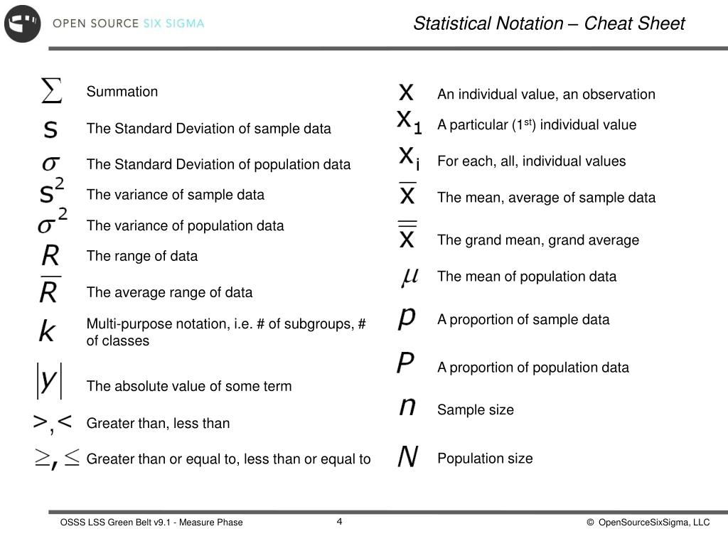 Summation An individual value, an observation A particular (1st) individual value The Standard Deviation of sample data For each, all, individual values The Standard Deviation of population data The variance of sample data The mean, average of sample data The variance of population data The grand mean, grand average The range of data The mean of population data The average range of data A proportion of sample data Multi-purpose notation, i.e. # of subgroups, # of classes A proportion of population data The absolute value of some term Sample size Greater than, less than Population size Greater than or equal to, less than or equal to Statistical Notation – Cheat Sheet