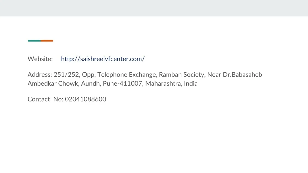 Website: http://saishreeivfcenter.com/ Address: 251/252, Opp, Telephone Exchange, Ramban Society, Near Dr.Babasaheb Ambedkar Chowk, Aundh, Pune-411007, Maharashtra, India Contact No: 02041088600