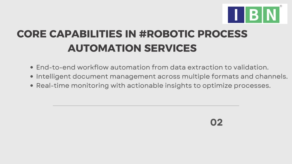 CORE CAPABILITIES IN #ROBOTIC PROCESS AUTOMATION SERVICES End-to-end workflow automation from data extraction to validation. Intelligent document management across multiple formats and channels. Real-time monitoring with actionable insights to optimize processes. 02