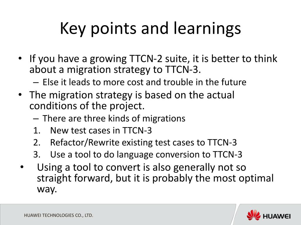Key points and learnings • If you have a growing TTCN-2 suite, it is better to think about a migration strategy to TTCN-3. • Else it leads to more cost and trouble in the future • The migration strategy is based on the actual conditions of the project. • There are three kinds of migrations • New test cases in TTCN-3 • Refactor/Rewrite existing test cases to TTCN-3 • Use a tool to do language conversion to TTCN-3 • Using a tool to convert is also generally not so straight forward, but it is probably the most optimal way.